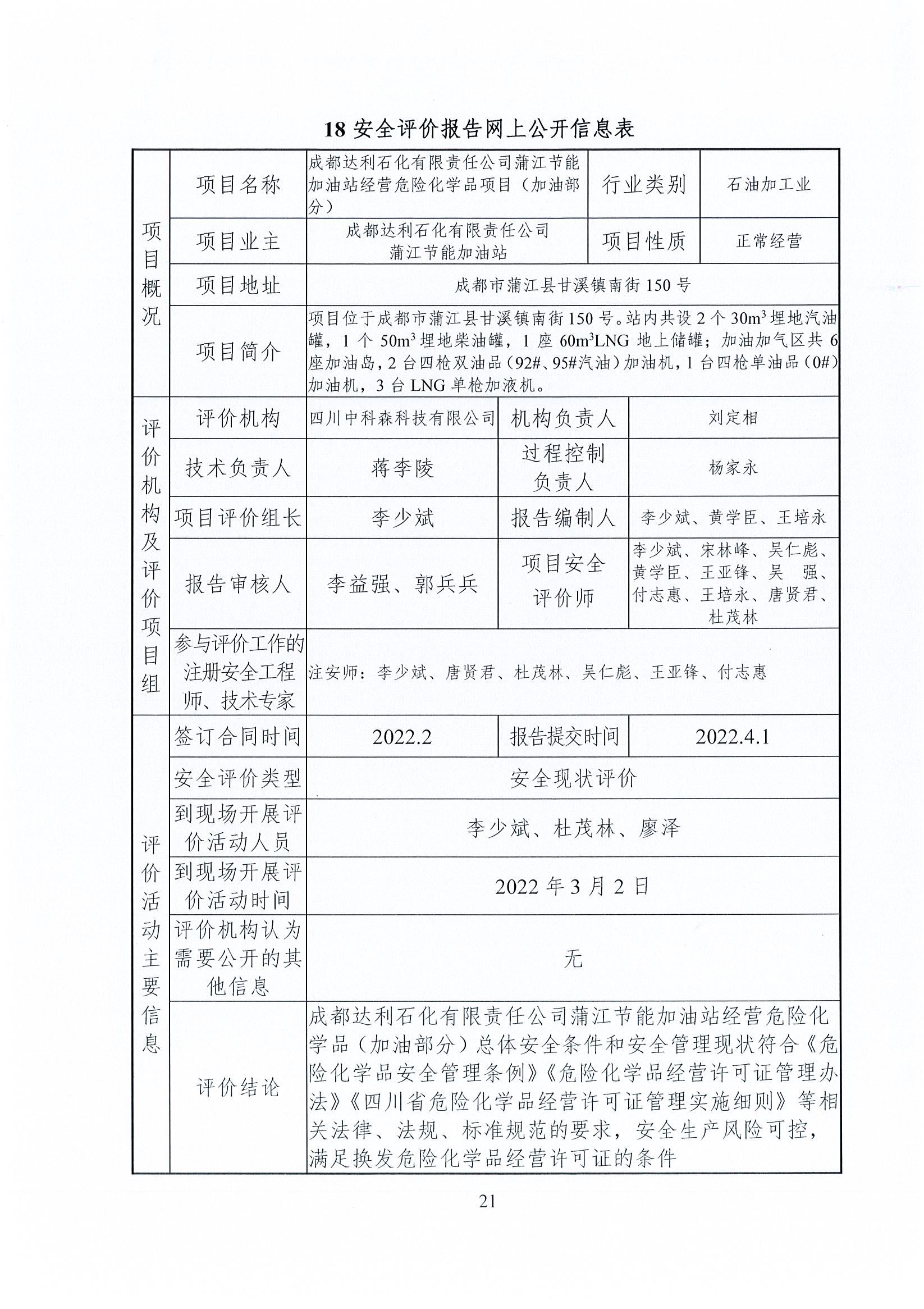 成都达利石化有限责任公司蒲江节能加油站经营危险化学品项目(加油部分)安全现状评价