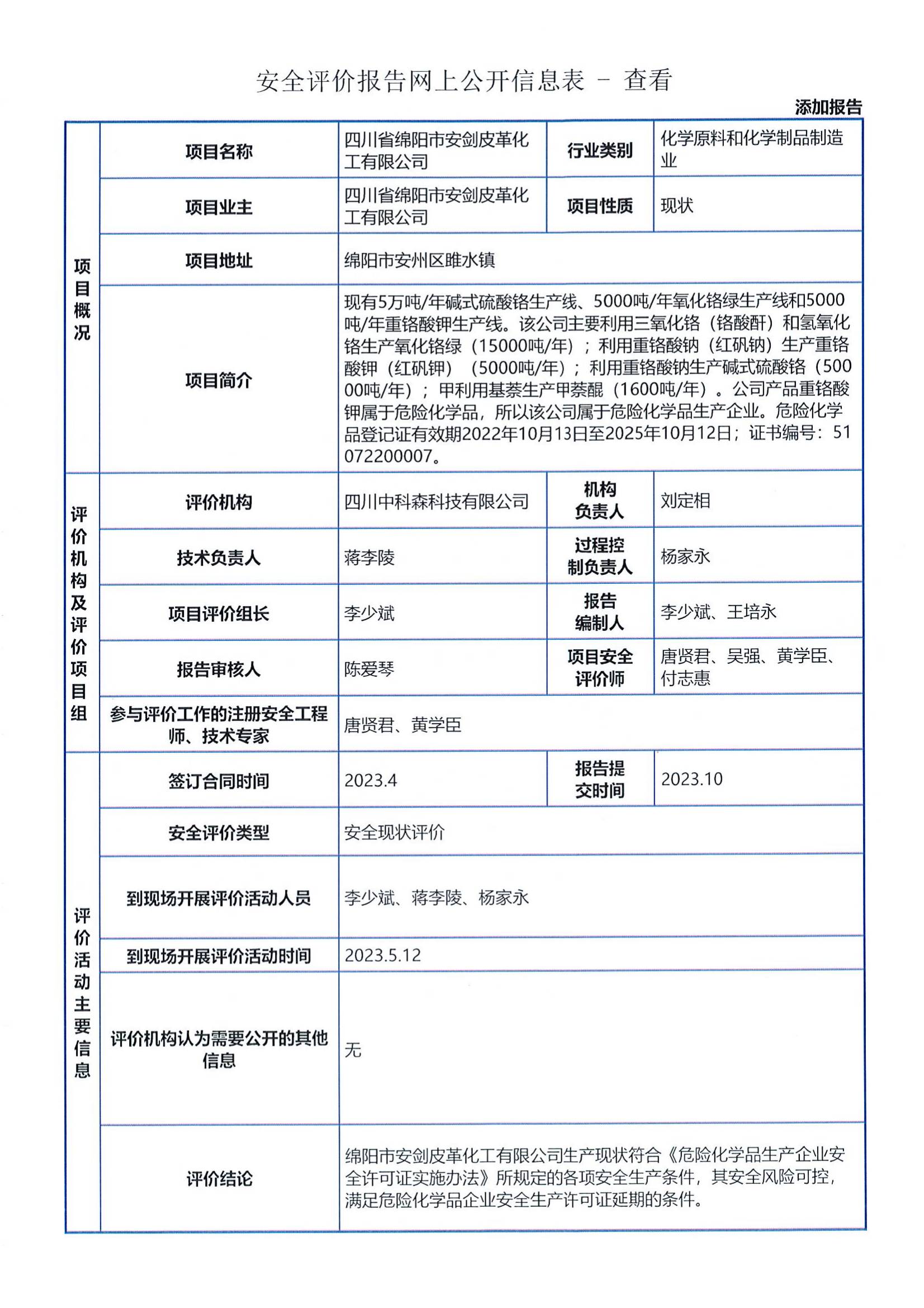 四川省绵阳市安剑皮革化工有限公司委托我司进行安全现状评价,我司于2023年5月组织评价人员进场实地勘察和收集资料。本报告根据本项目的实际特点,分析评价其存在的危险、有害因素的种类和发展规律,定性定量评价危险有害程度,提出了安全对策措施及建议,作出安全评价结论。根据《安全评价通则》和《危险化学品生产企业安全评价导则(试行)》,结合《四川省危险化学品生产企业安全生产许可证实施细则》的相关要求,编制完成了《绵阳市安剑皮革化工有限公司安全现状评价报告》。